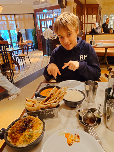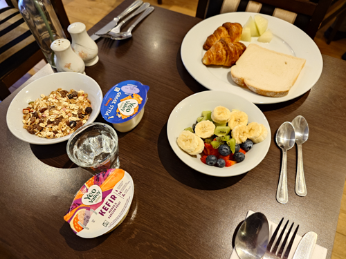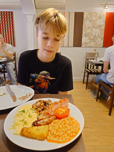 Det var jättegod frukost på hotellet. Ni kanske kan gissa vems tallrik som är vems 😉