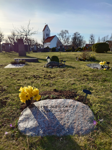 Det var en vacker vårdag, och jag var vid graven och satte påskliljor från Slättaröd. Några krokusar som jag planterade förra året hade också börjat titta fram.